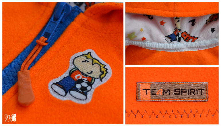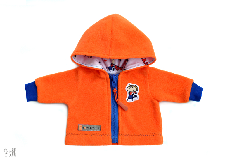 Толстовка из неоново-оранжевого флиса, застегивается на молнию, в капюшоне - подклад из кулирки х/б.