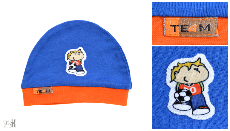 Шапочка из кулирки с/л, украшена нашивкой и аппликацией из кулирки х/б.