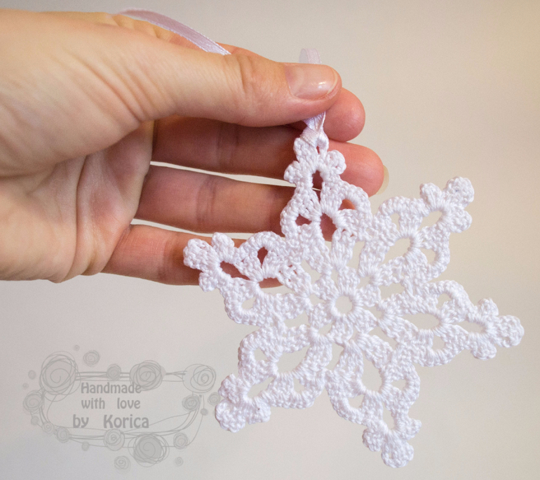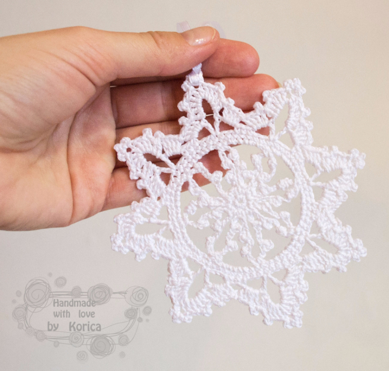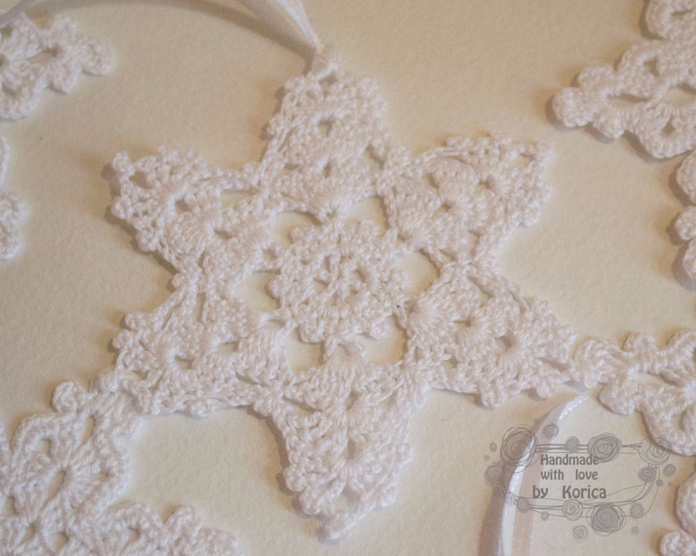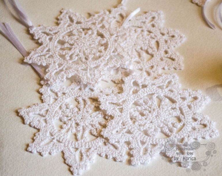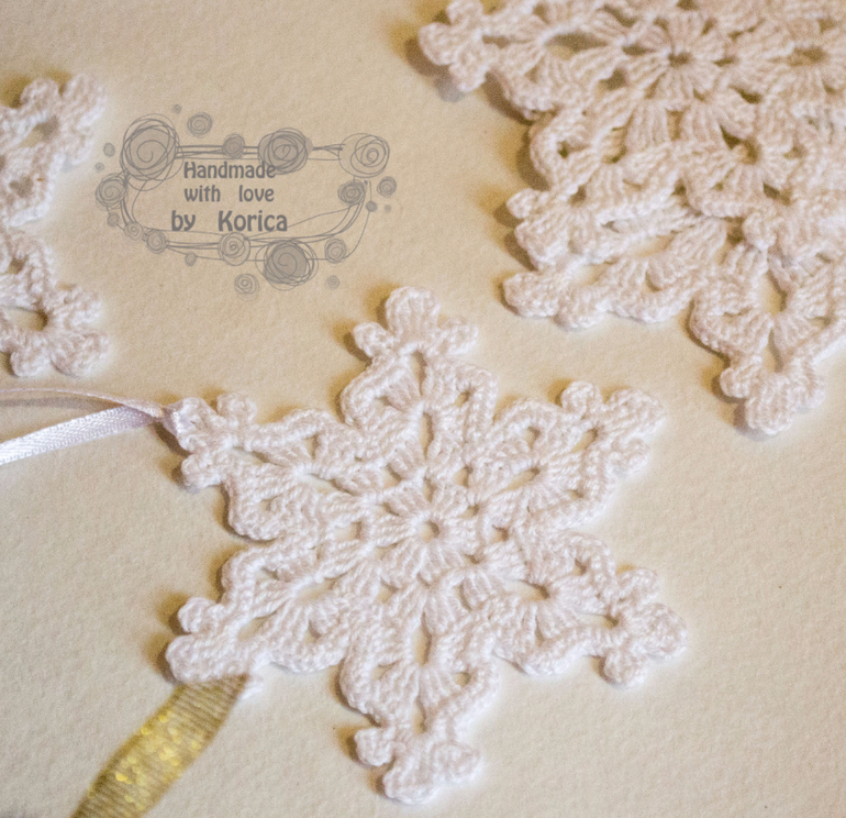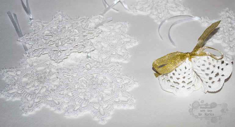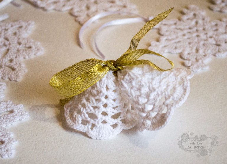 Размеры у снежинок разные, от 5см и до 12см, в основном вяжу проверенные "модельки", поскольку один раз вязала все подряд, но в итоге не все понравились, то криво, то косо, то смотрятся убого, и остановилась на этих красотках)))), а также связались колокольчики, такие миииииилые они для меня!