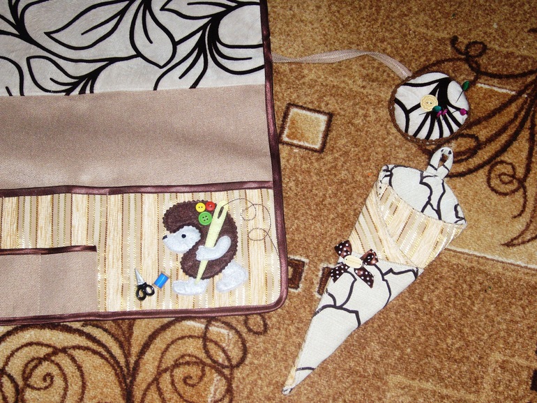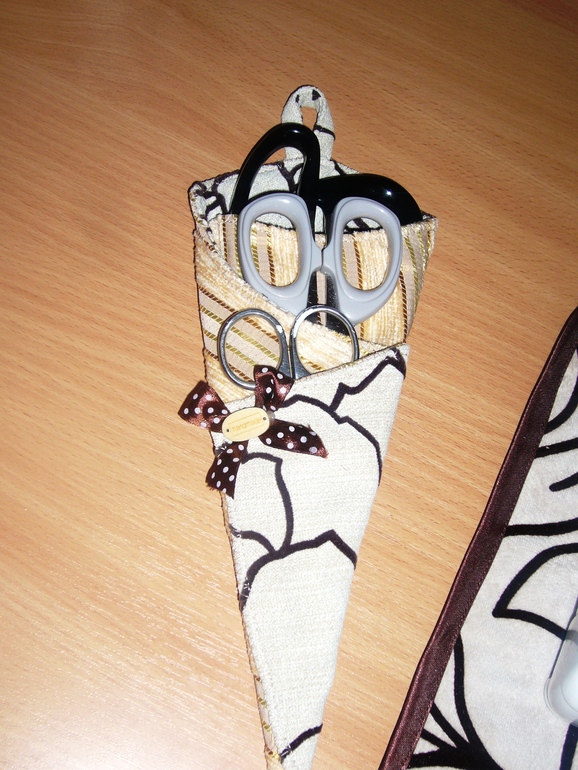Еще ,из остаточков сшила чехольчик,нравится мне их шить. Имеет три кармашка разной глубины.Много ножниц бывает у тех кто шьет,по себе знаю).Теперь уже комплектом можно считать наборчик)))