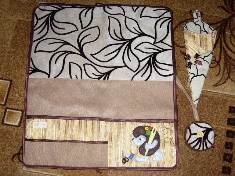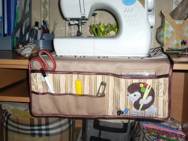 Внизу расположены 7 карманов,можно расположить все нужное для шитья(сантиметр,мелки,распарыватель,нитки,маркер,карандаш и тд.)Также,сбоку имеется игольница под булавки.