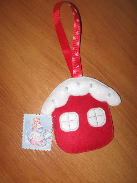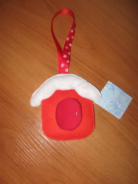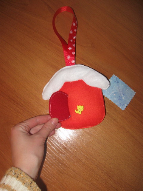 Домик: фетр, наполнитель - синтепон, кошка-пуговица, репсовая лента. Мишка: фланель, репсовая лента, мордашка и пузцо из белого мягкого фетра, пуговка-цветочек, глазки бегающие, наполнитель - синтепон + гремелка.