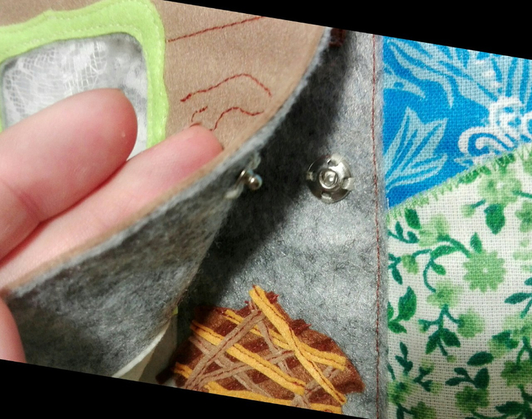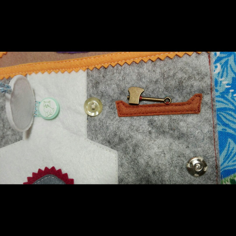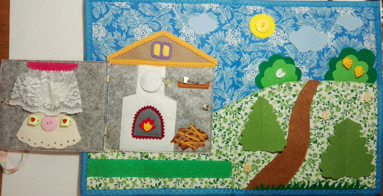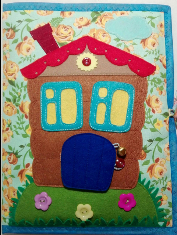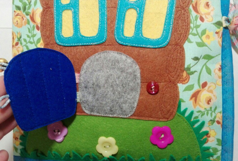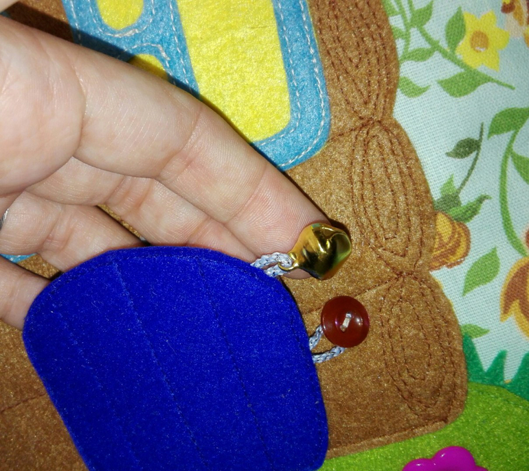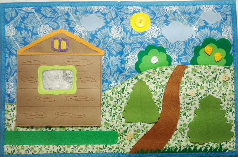 Домик закрывается на кнопку, за елочками прячутся пуговки-животные