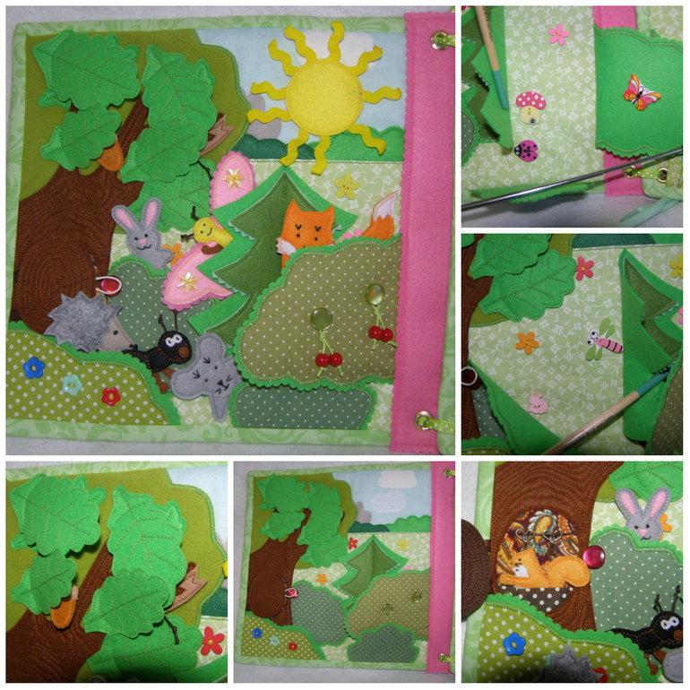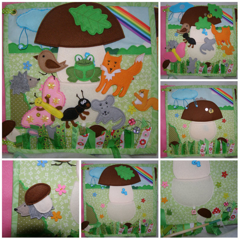 Солнце на липучке, желудь- на металлической петельке, ягодки - на петельке. Их можно вешать в дупло к белочке на крючки. В грибочках - скрепки, внутри ежика - магнитик. Поэтому когда ежик бродит по лесной опушке - к нему могут прицепиться грибочки.
