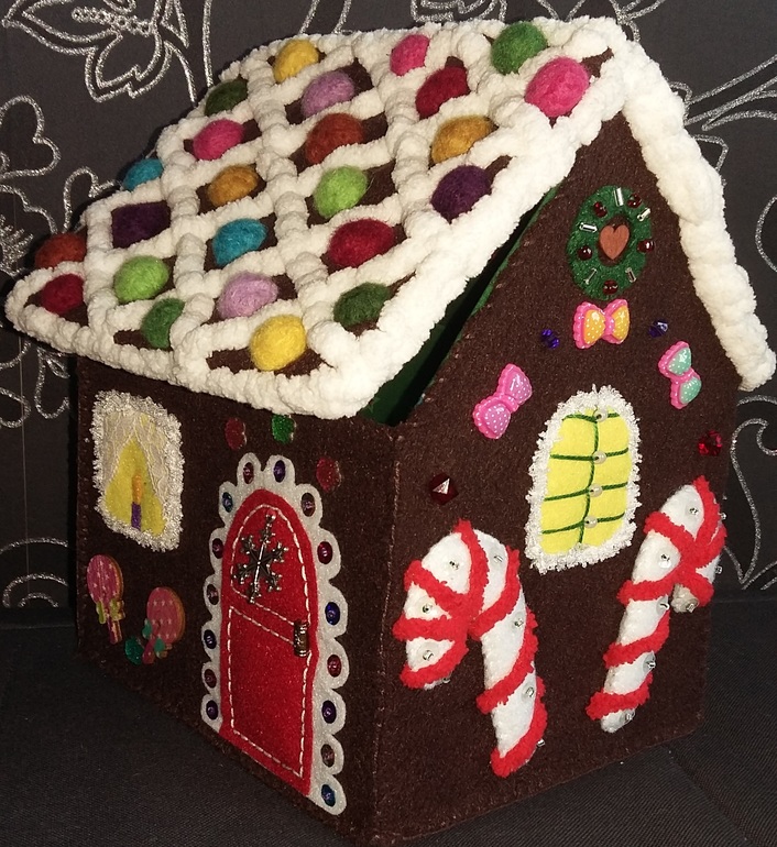 Делала его из мягкого 2 мм фетра. Далее для кажд. детали домика вырезала толстое картонное основание, обклеивала его новогодней тканью (при помощи утюга и паутинки) и прикрепляла к фетровой детальке самого домика. Картонное основание по размеру делала чуть меньше фетровой основы, чтобы легче было сшивать фетровые части между собой. Картонную часть с фетровой частью скрепляла при помощи утюга и широкой "паутинки". На крыше валяные шарики, кот очень хорошо пришиты. Далее уже шло в ход все.. пряжа, фетр, бусины, пайетки, шармики, бисер.... Все оченььь хорошо пришито. Ну а теперь фото поближе (я сама очень люблю рассматривать все рукоделки поближе...)