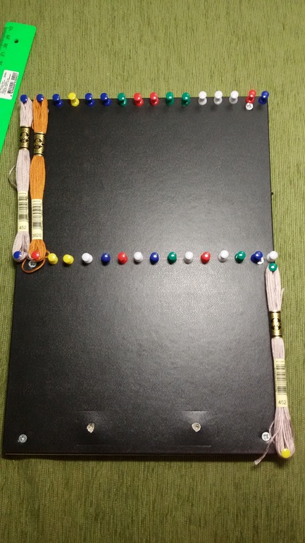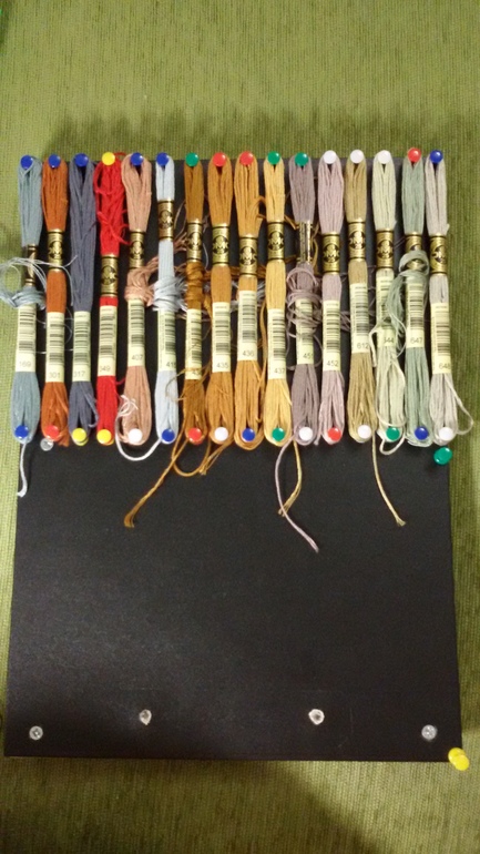 Далее с лицевой стороны на расстоянии 1,5 см друг от друга втыкали канцелярские кнопки по высоте мотка. В верхний ряд вместилось 16 мотков и в нижний тоже. (второй ряд не закончен - закончились кнопки)