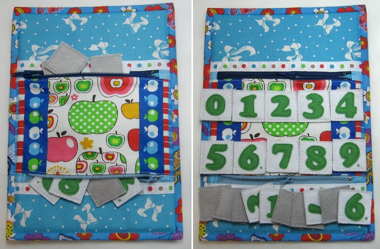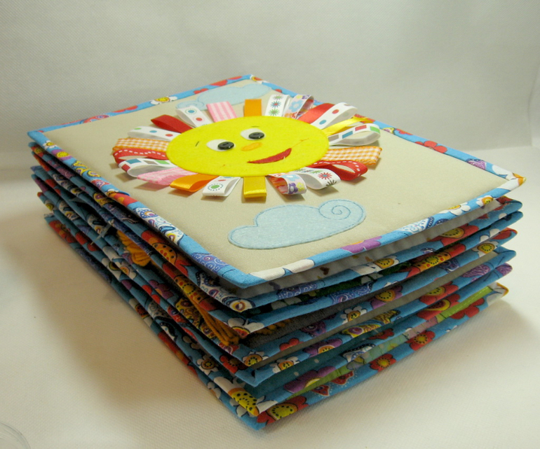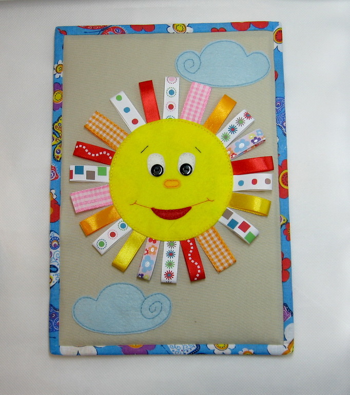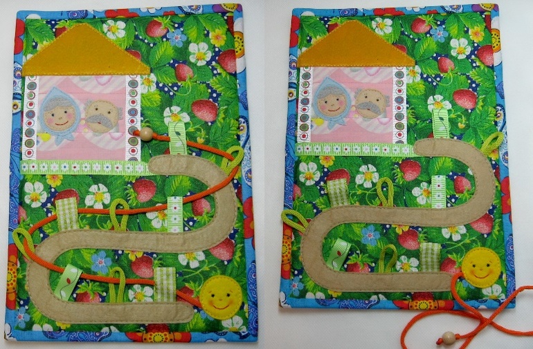 Развивающие игрушкиПервый раз шила не книжку, а модули по отдельности. Весьма интересный опыт. Внутри всё также поролон. Материалы использованы разные - хлопок, смесовые, фетр. Дополнением идут ленты и шнуры, пуговки. Размер А4 (как альбомный лист, примерно 20 х 30 см)