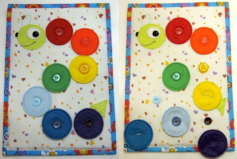 Веселая гусеничка - изучаем цвета радуги (они же основные и дополнительные цвета). Развиваем мелкую моторики - пристегиваем кружок на пуговку. Также можно сопоставить размеры:большой кружок-маленькая пуговка.