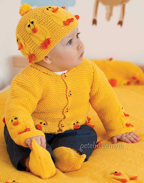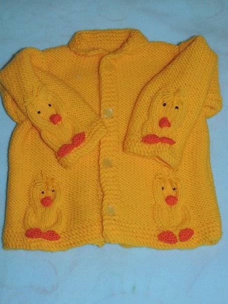 Копалась как то в инете и увидела вот такую красоту, не смогла с ней расстаться и решила повторить для своего карапузика. Сбегала в магазин, выбрала нитки "детский хит" цвет подсолнух и начала творить красоту. Как потом оказалось, не так уж и просто сделать точь точь такую же, пуговиц "утята" в нашем городишке не нашлось, пришлось заменить на другие, пинетки связала на свой вкус, да и шапочка немного другая. Спустя нескольких бессонных ночей и трудоемких дней(вязала в моменты отдыха своего малютки) получилась у меня вот такая кофточка на весну...