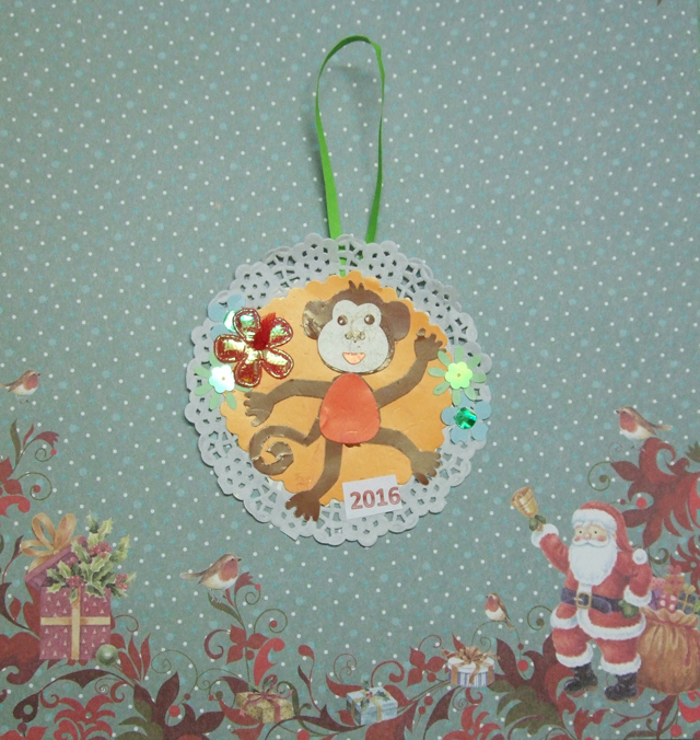 Еще сделала открытку с обезьянкой- символом 2016 года. На маленькую круглую ажурную салфетку приклеиваем вырубки- детальки тела обезьянки. Сзади- петелька, сверху ее закрываем- приклеиваем кружок.
