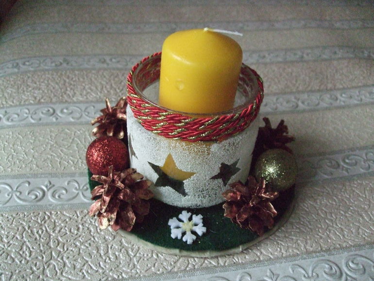 Подсвечник делала так: Круг из картона обтянула тканью (складки спереди), приклеила ее горячийм пистолетом, приклеила дно банки, которую оформила так: приклеила из скотча вырезанные звезды, остальную поверхность намазала клеем ПВА и обсыпала манкой, просушила и сняла звезды. Низ свечки немного подплавила и поставила в середину банки. Верх- приклеила отделочный шнур, подставку подсвечника украсила крашенными золотой акриловой краской шишками, шариками и снежинками.