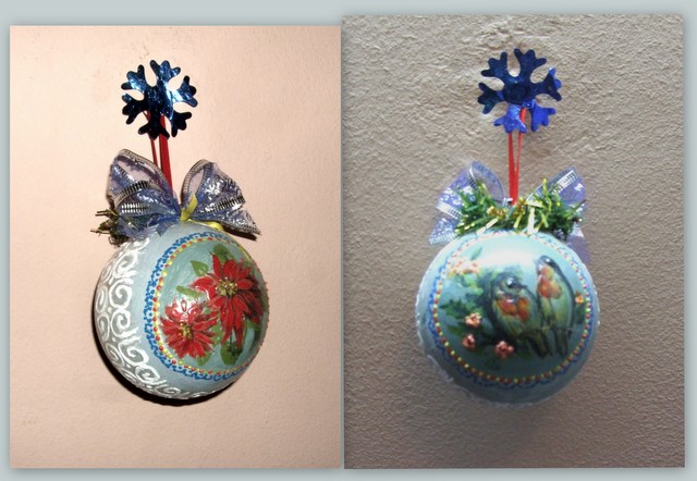 Приклеила 2 фрагмента из салфетки, контуром нарисовала по шву орнамент и точками вокруг картинок, сделала объем на пуансетии и причках прозрачным гелем, покрыла 2 раза полуматовым акриловым лаком. Оформила сверху бантом и веточкой ёлки на горячий пистолет. По сути, это мой первый декупажный шарик, уже стала разбираться, где и как делать.