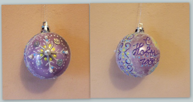 Контурами нарисовала снежинку и прилепила на нее стразы, жемчуженки, стеклярус., подрисовала контурами узор "по шву" шарика.