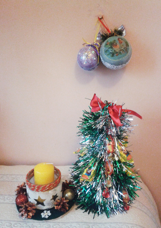 Сделано к Новому году-шары, конфетная ёлка и подсвечник.