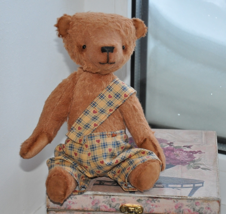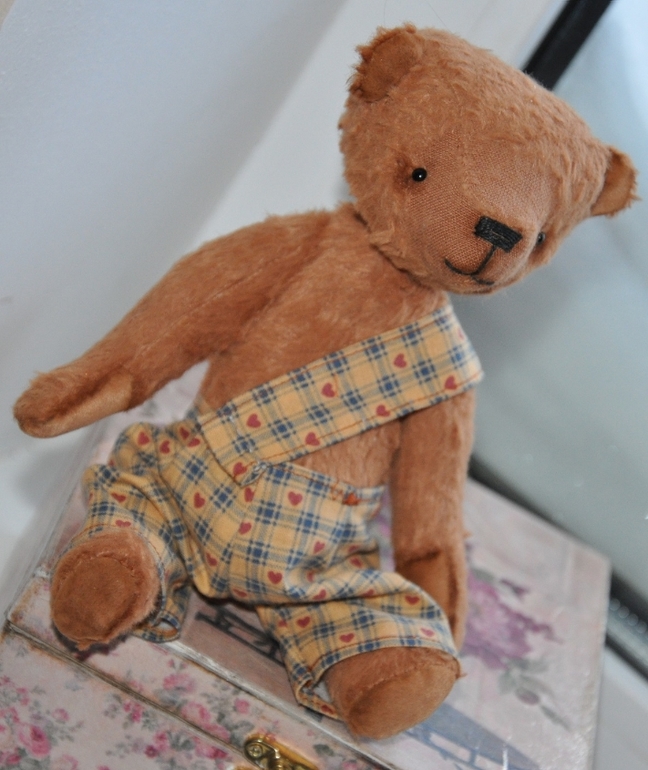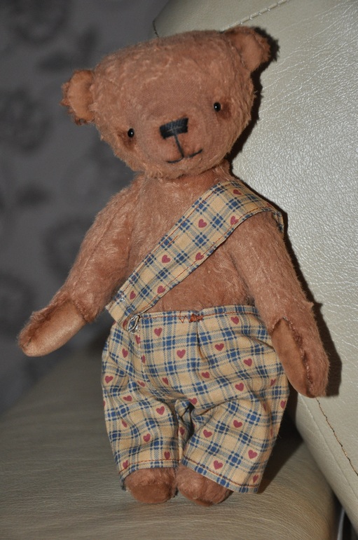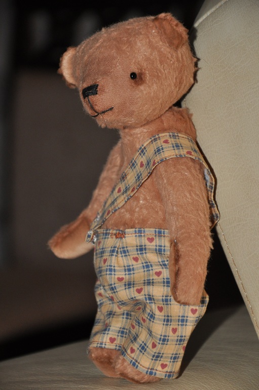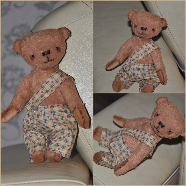 Миша сшит из вискозы. Набит опилками и шерстью. Тяжелый малыш за счет гранулята. Шплинтовые крепления, головка плавно покачивается. Тонирован маслом. Глазки стекло, Германия. Ростик 20,5 см. Штанишки на кнопочках, снимаются. И мы любим позировать.
