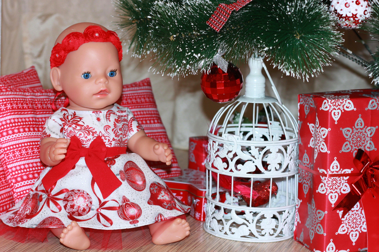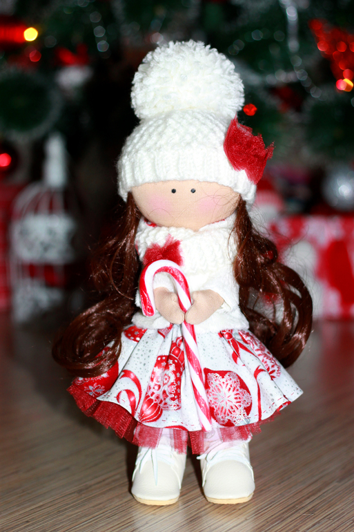 И не могу не показать самый лучший подарок на Новый год от крестной Полинке - куколка в платье из такой же ткани.