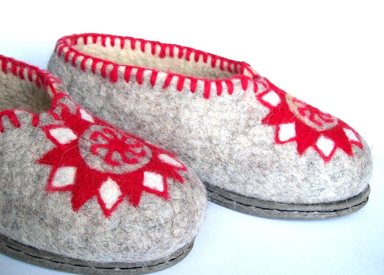 Фелтинг (валяние шерсти)Свалялись тапочки для мальчишки с русским оберегом " Колядник". Эти тапочки из настоящей деревенской шерсти, не крашенной, живой! Прислали мне ее из Псковской области. Шерсть чудесная, совсем не похожа на обработанную фабричную.