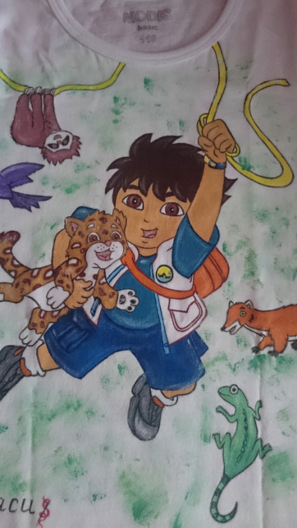 Нике нравится мультик "Диего" и она хотела что-нибудь с ним. Я покопалась в интернете и ничего не нашла. И конечно же спас меня наш любимый ББ, а именно прекрасная рукодельница Елена. Когда все думали что накрыть на стол, она рисовала нам футболочку. Леночка спасибо тебе ОГРОМНОЕ за то, что ты так быстро нарисовала и отправила нам эту красоту!!!