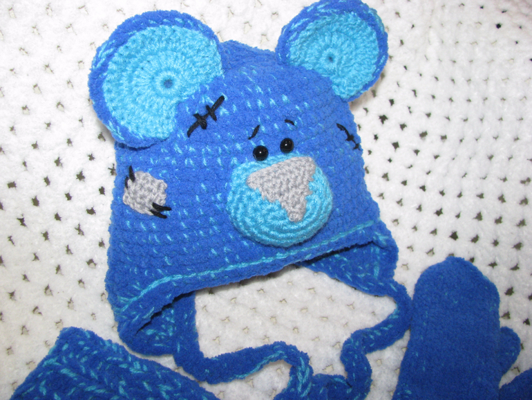 Насмотрелась здесь на шапки-мишки, тоже захотела. Быстро взяла, начала (вчера) и закончила (сегодня) комплект для сына.