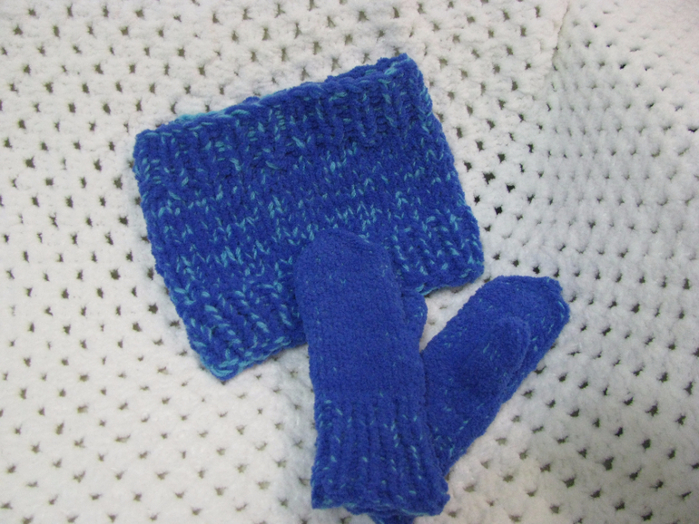 Итак: Шапка - Alize Softy цвет 141 Василек в 2 нити + Alize Sekerim цвет 287 Бирюза в 1 нить, крючок 4, варежки - Alize Softy цвет 141 Василек в 2 нити + Alize Sekerim цвет 287 Бирюза в 1 нить, чулочные спицы 4, снуд - Alize Softy цвет 141 Василек в 2 нити + Alize Sekerim цвет 287 Бирюза в 2 нити, спицы 5. Расход на все - Alize Softy 3 с половиной мотка по 50 гр., Alize Sekerim меньше 1 мотка по 100 гр.