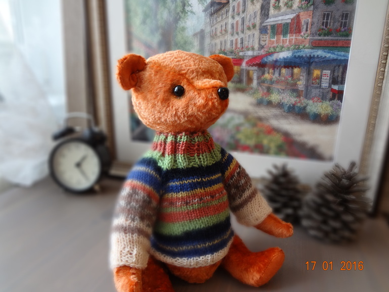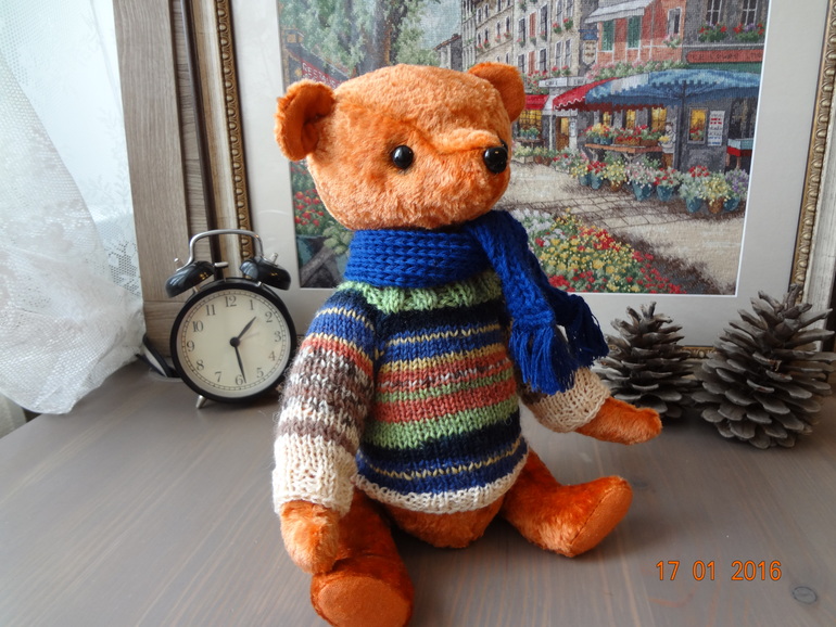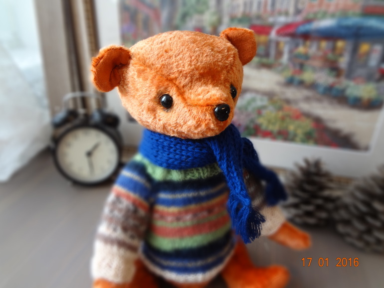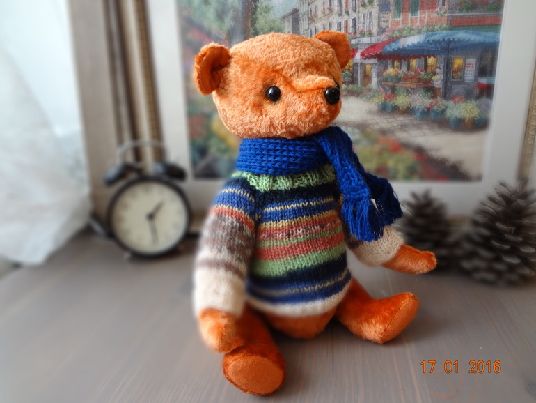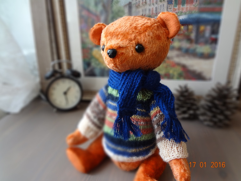 Игрушечный мир - животныеЭтого мишку шила на заказ и очень переживала,получиться ли то,что хотели,сегодня мишутку забрали и остались довольны,а это самое главное))). Назвала его Абрикосом,он такой же мягкий и абрикосового цвета. Рост 30см. Сшит из винтажного плюша,шплинтовое крепление,набит плотно опилками,утяжелен стальным гранулятом,довольно тяжеленький. Глаза и носик стеклянные. Связала мишутке свитерок,без него он мне показался голеньким,ну и шарфик повязала,чтобы было ему теплее))).