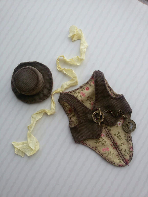 Сшит из винтажного плюша, набит опилками и металлическим гранулятом. Голова качается, лапы двигаются. глазки стеклянные, производство Германия. Искуственно состарен масляными красками. Жилет сшит из микровельвета, подкладка - хлопок. На шее - шебби-ленточка. Жилет снимается, шляпа - нет.