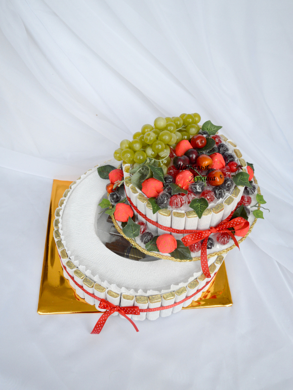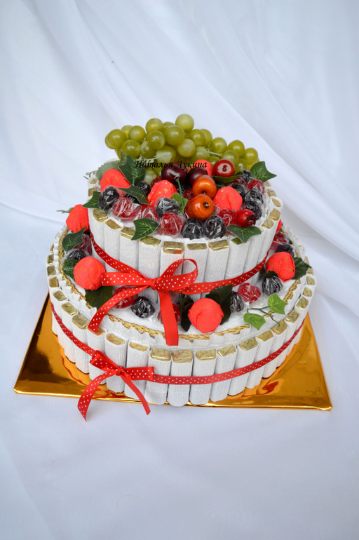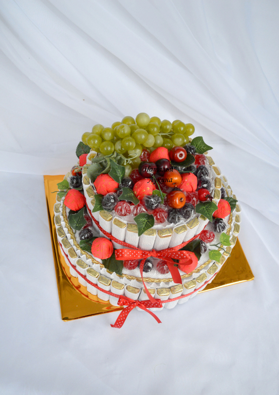 У свекрови был юбилей и решено было подарить торт из конфет, как дополнение к основному подарку. Вроде бы неплохо получилось для первого тортика, как считаете?