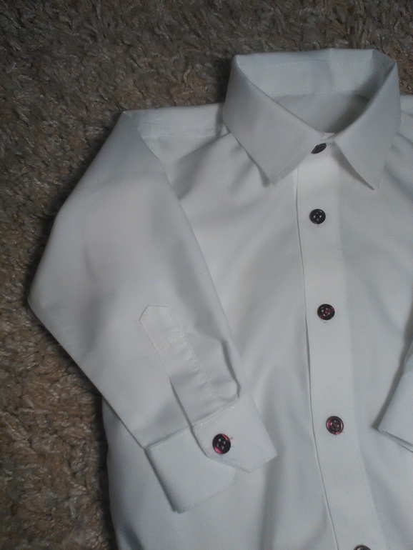 Выкройки те же, что и в предыдущем костюмчике (Оттобре 1/2004, модель 7, Оттобре 3/2009, модель 11), к рубашке прикроила трусики снизу, чтобы вышел боди. Кнопки снизу на боди, контрастные пуговки, манжеты как на взрослой рубашке, стоечка. Брючки с прорезными карманами-обманами сзади, спереди классические кармашки. Подтяжки делала сама в этот раз)