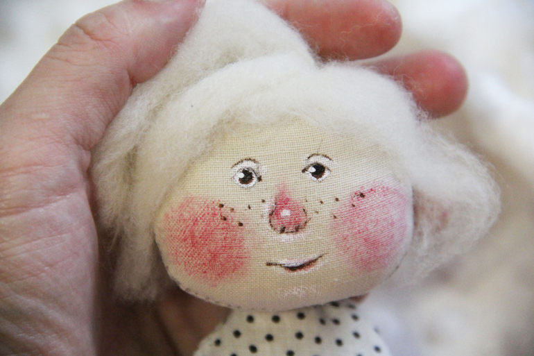 Малышка 15 см ростом, ручки-ножки двигаются, сшита из тонированной бязи, расписана акриловыми и масляными красками, волосики-шерсть для валяния