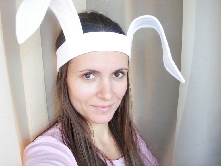 Для мамы-Зайки: Ушки на проволочном каркасе в виде повязки, морковные бусы и хвостик. Для папы-Зайца: ушки, галстук-бабочка (морковки рисовала акрилом) и хвостик.
