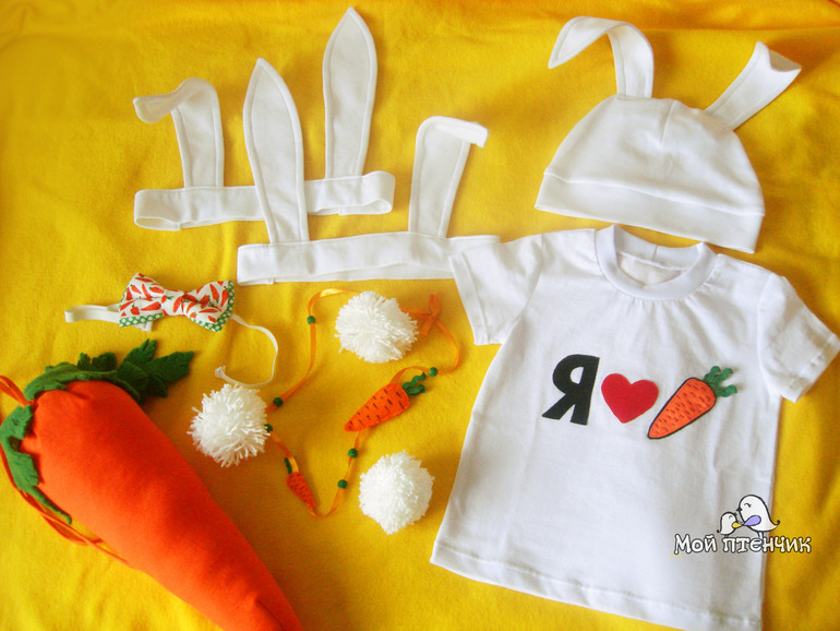 Для мальчика-Зайчика: футболочка с аппликацией, шапка с ушками на тонкой проволоке, рюкзак-морковка и пушистый хвостик.