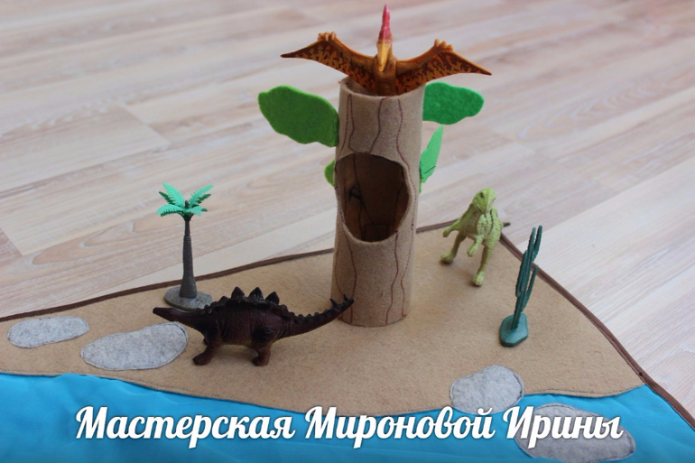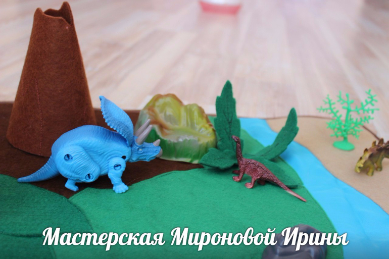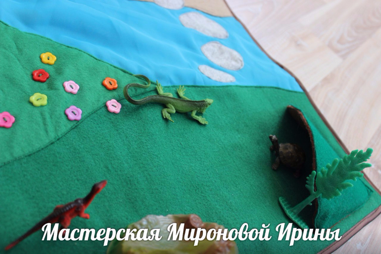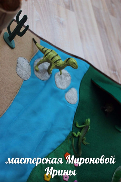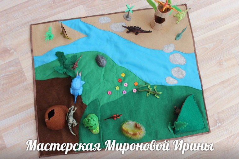 ФетрСтаршая дочка сильно увлеклась динозаврами, и чтобы ей было веселей в них играть, подглядела в интернете идею коврика для игр. Вот что сшилось в моем исполнении.