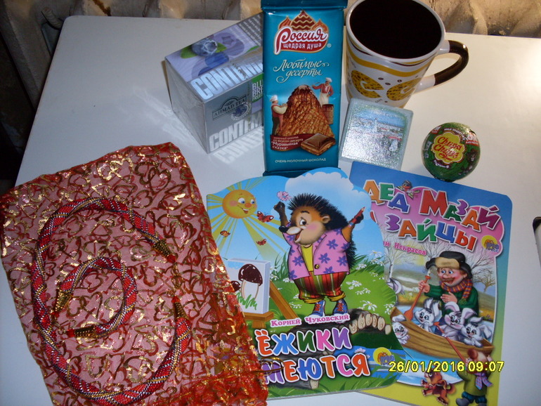 Димику Лиля прислала две чудесные книжки,он у нас не очень любит читать,но картинки посмотрел с удовольствием и не раз!)Ну и сладости-это наше все!)шоколад и киндеры мы просто обожаем! А еще были кружка и ароматный чаек с голубикой,ммм...)Ну и,собственно,предмет нашего с Лилей обмена-комплект состоящий из жгута и браслета из бисера-красоты невероятной!!! Попытки сделать хоть одну приличную фотографию не увенчались успехом(то ли фотик такой,то ли фотограф косорук)))),поэтому фото автора.