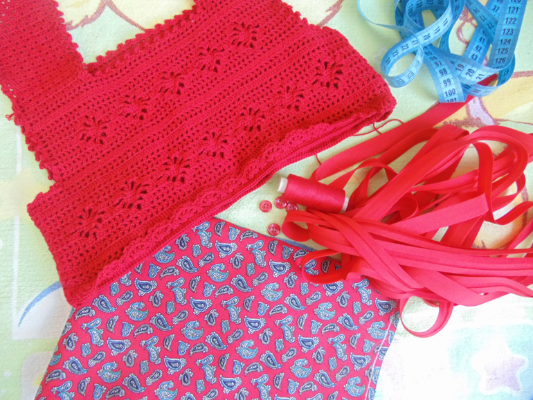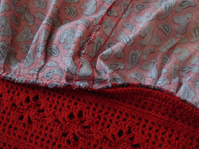 На подол использовала отрез хлопковой ткани 1,4мх0,5м. Низ обшила косой бейкой из хлопка, верх присборила и пришила к ряду столбиков с/н.