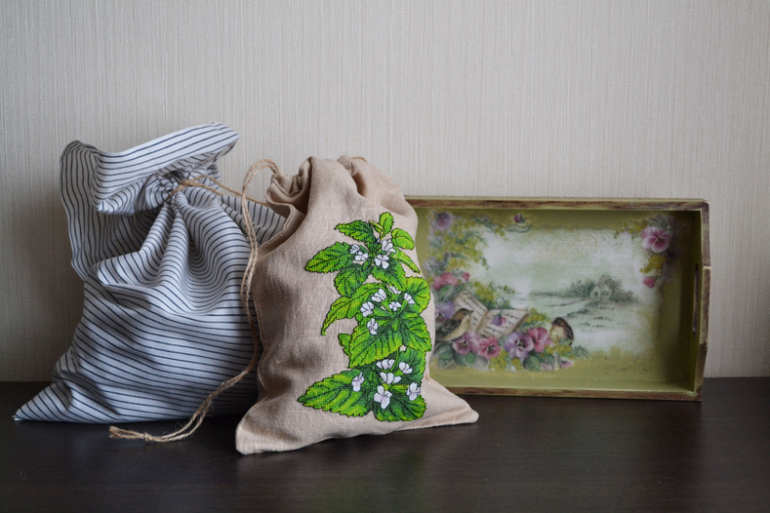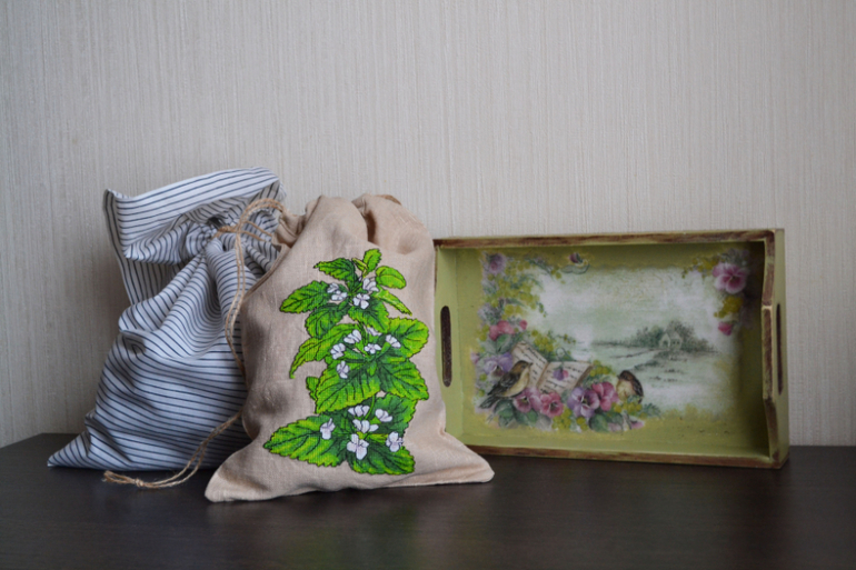 Героиня посылки - мята! Мешочек, просто не представляете сколько сил он занял и времени у Тани!!! Получился чудесный, Таня, поверь мне!! А еще в посылке был огромный мешок с сушеной мятой, когда открывали посылку, я совсем забыла про это и спрашивала у мужа он ли жует мятную жвачку (он в принципе их не жует, но больше не на кого было подумать))))) Ну и мечталка давняя: поднос под чаек с вкусняшкой...не для худеющих и стройнеющих))Птички!)))