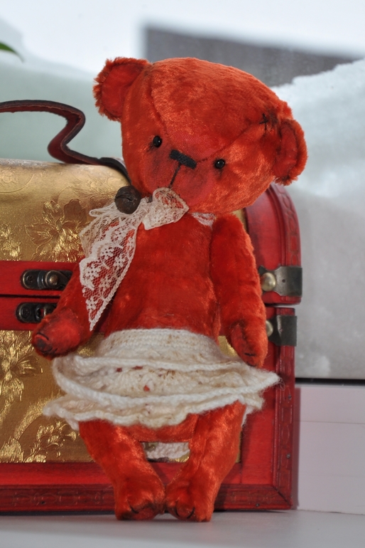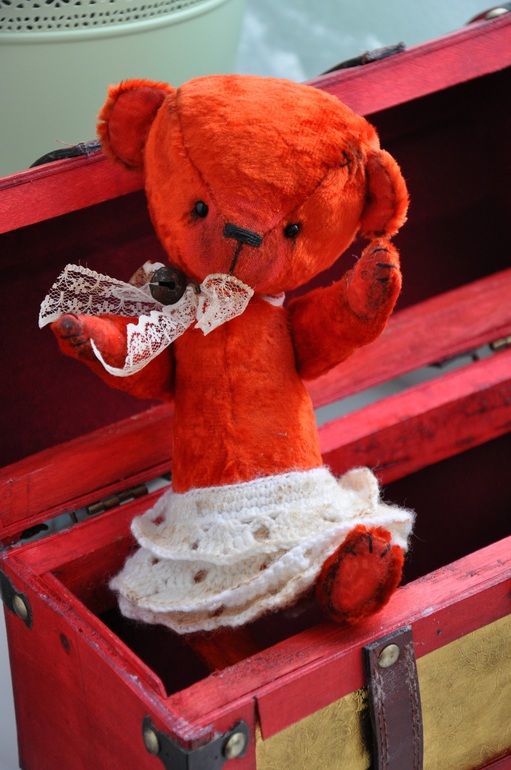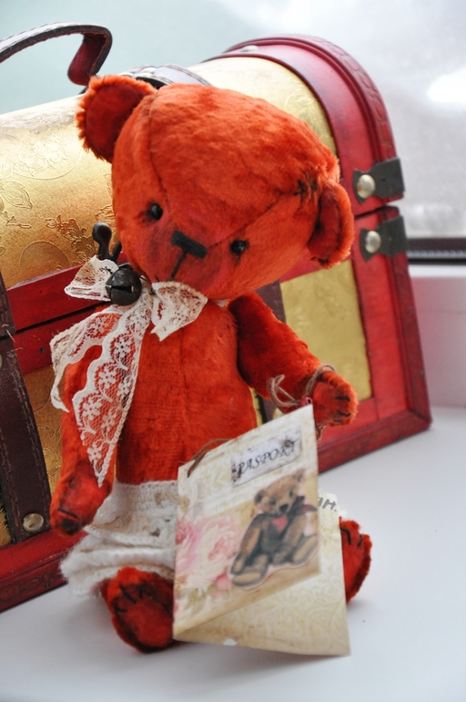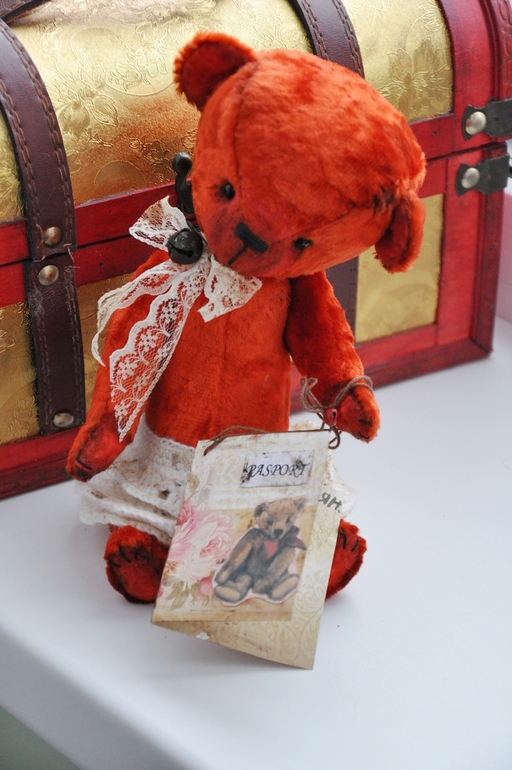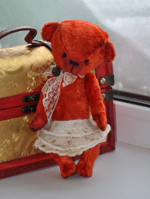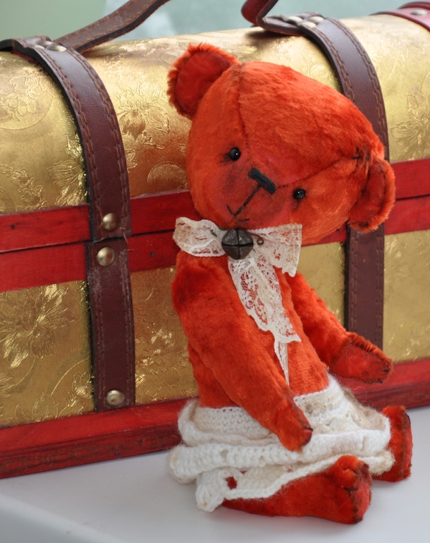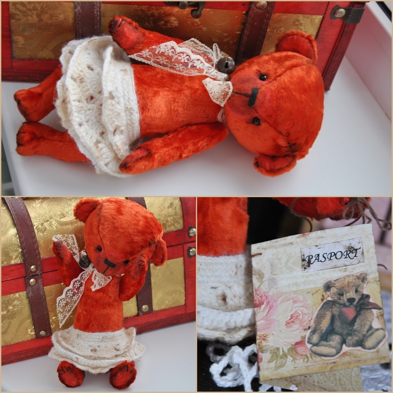 Игрушечный мир - животныеРостик 21, 5 см, советский плюш, опилки, стальной гранулят, стеклянные глазки, 6 шплинтов, диски. Голова покачивается. Состарена маслом. Одета Марго в вязаную юбочку, которая испачкана маслом с корицей и ванилью, вкусно пахнет. На шее испачканная кружевная лента и ржавый бубенчик на булавочке. Авторская выкройка. Приглашаю к просмотру.