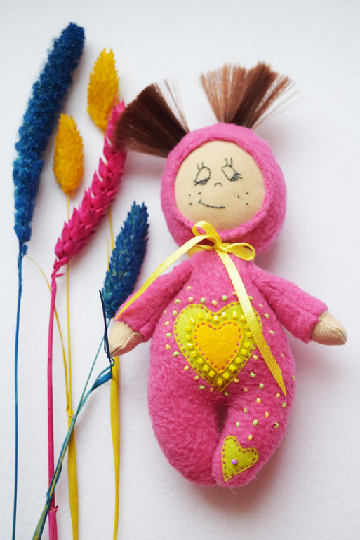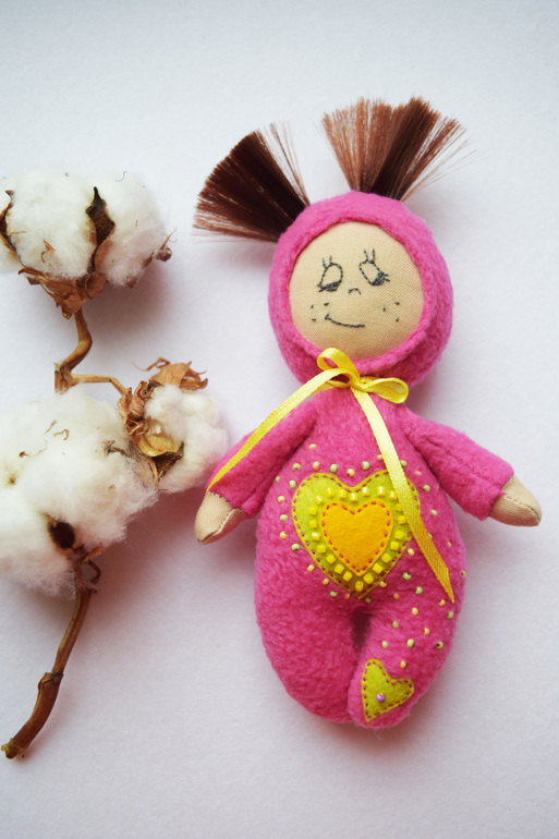 Пока мои мыши - зайцы -мишки гостят на выставке я решила изменить привычным формам и попробовать что-то новенькое. И, родилась такая вот чудесная девочка. Она из мягкого флиса, поэтому так и хочется её потискать. Куколка 15см без учета хвостиков.