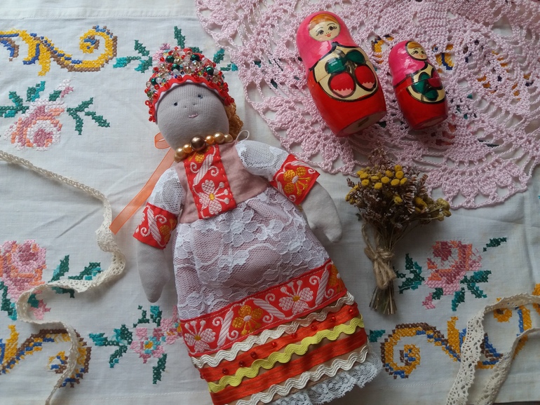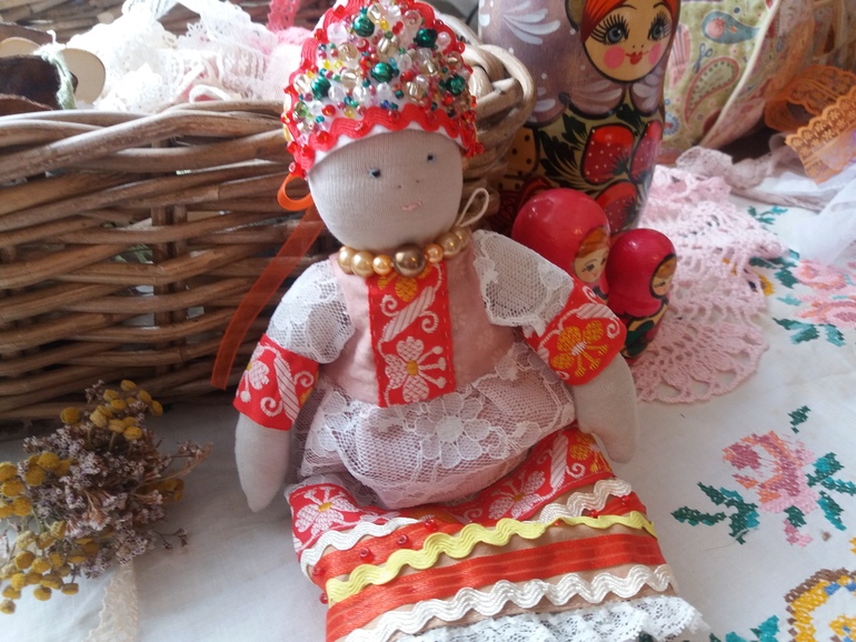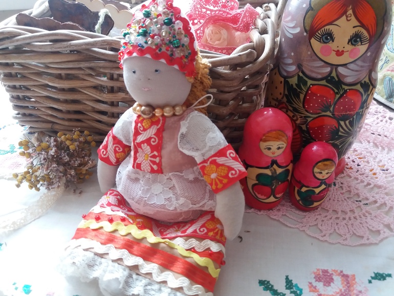 Поделки с детками.У сына в саду конкурс, нужно принести куклу в русском костюме и вот сотворилась такая куколка.Не судите строго, шила подобную первый раз.Для шитья тела взяла МК вальдорфская кукла, использовала небольшой кусочек трикотажа.Платье сшито из хлопка, гирюра, тесьмы.Кокошник из фетра, украшен тесьмой и бисером.Волосы из пряжи АлизеРомантика.Рост у куколки 25см.