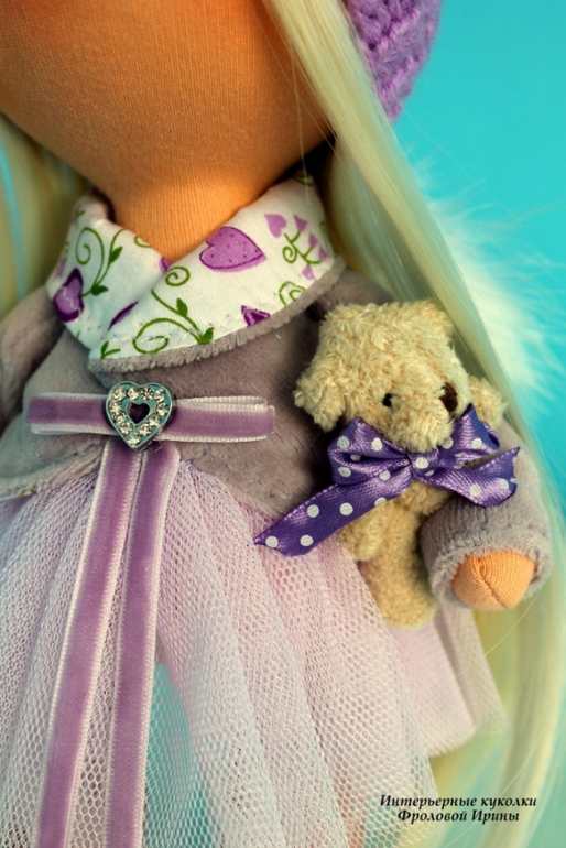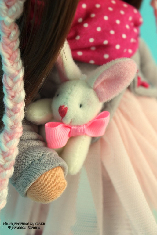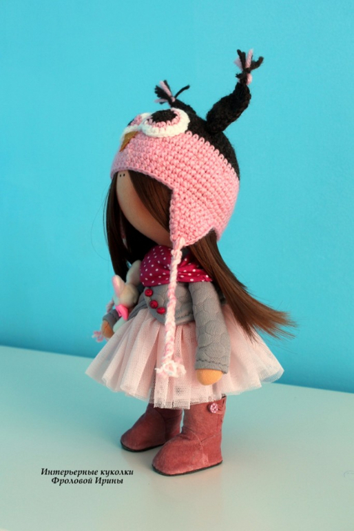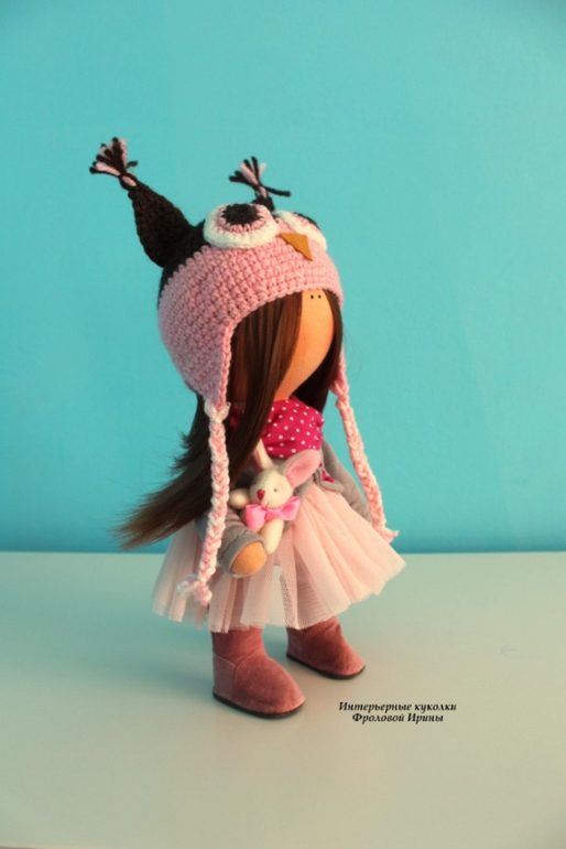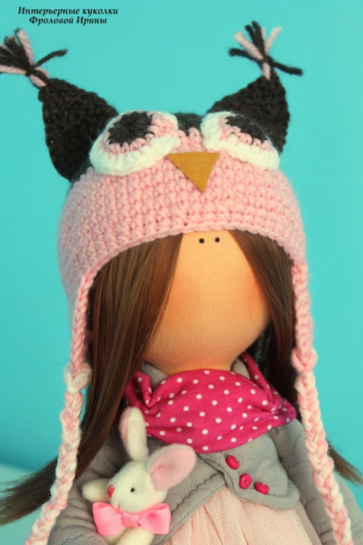 Куколку шила с учетом всех пожеланий, а именно - серо-розовая гамма, темно-русые волосики, зайки-совы