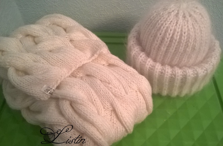 2. Комплектик из всем уже изрядно надоевшей шапки с двумя отворотами и двухметрового шарфа косами. На этот раз брала мохер от Камтекс , оказался