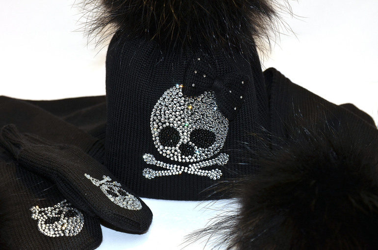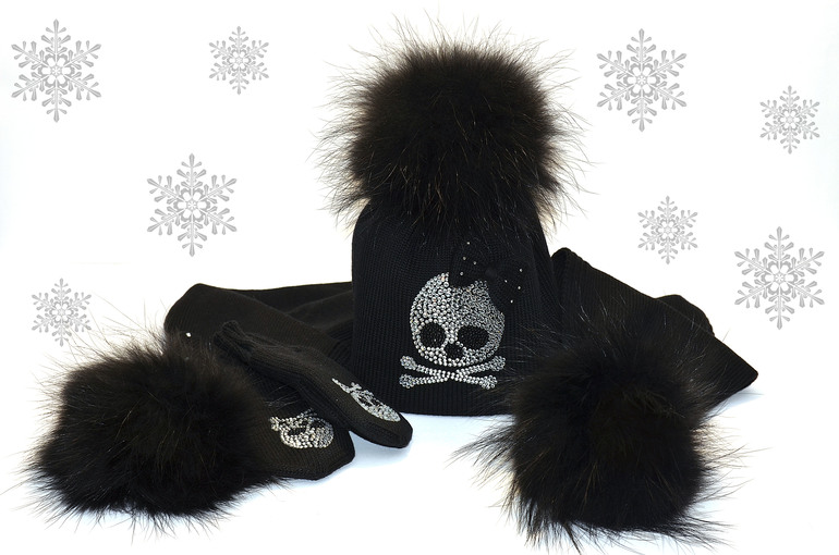 Машинная вязка (РАБОТЫ И СХЕМЫ)Попросили очень необычный дизайн. Поначалу терзали сомнения насчет "мрачности" исполнения, все-таки черный комплект, черные бубоны, череп... и все для малышки. Но результат превзошел все ожидания, получилось очень мило. Прошу под кат и фото на обладательнице этого комплекта