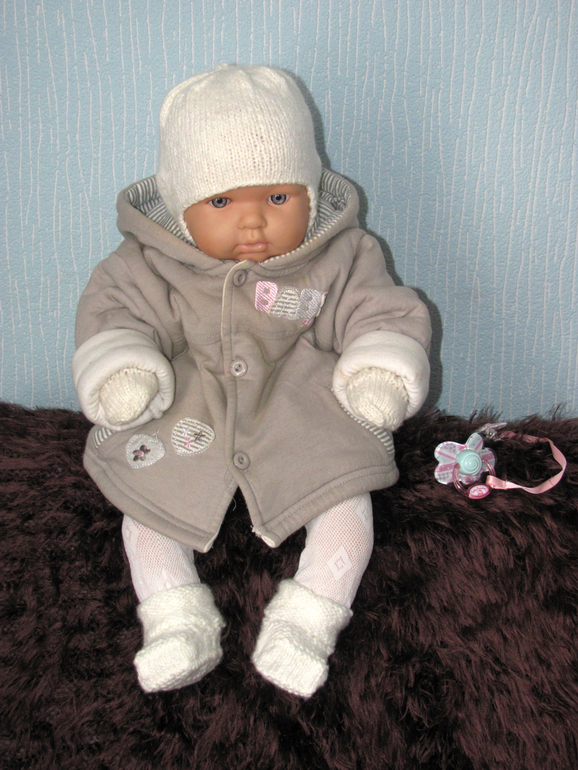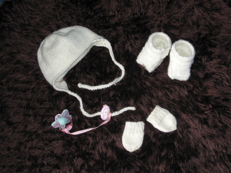 Вязание спицамиРешила порадовать дочку и связала для ее любимой куклы шапочку, варежки и пинетки.