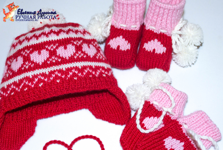 На шапочке жаккард связан, на пинетках и варежках сердечки вышиты.