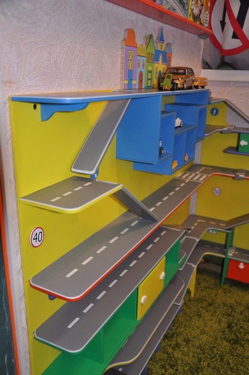 Работа с деревомУгловой стеллаж-паркинг с отдельными полочками, боксами и дорогой с разметкой)) глубина всего 10см. Длина левой стороны 100см, длина правой 120см, высота 70-90см. Знаки дорожного движения на магнитах и легко меняются местами, дверцы с белыми стрелками - перемещаются, наклонные пандусы также подвижны. Так же имеются "лежачие полицейские" - съёмные. Полностью ручная работа. Приятного просмотра. Далее более 5 фото.