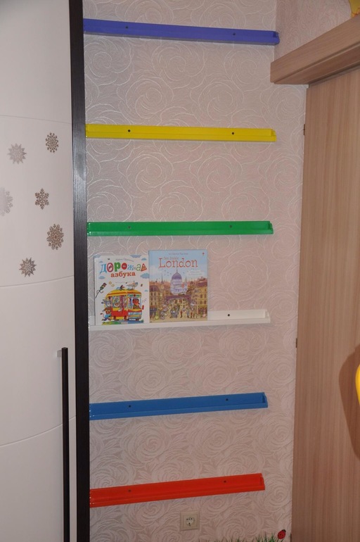 И полочки для книг по стилю в детскую, с колёсами по бокам (имитация бампера) и декоративными вставками. Маленький хозяин доволен.
