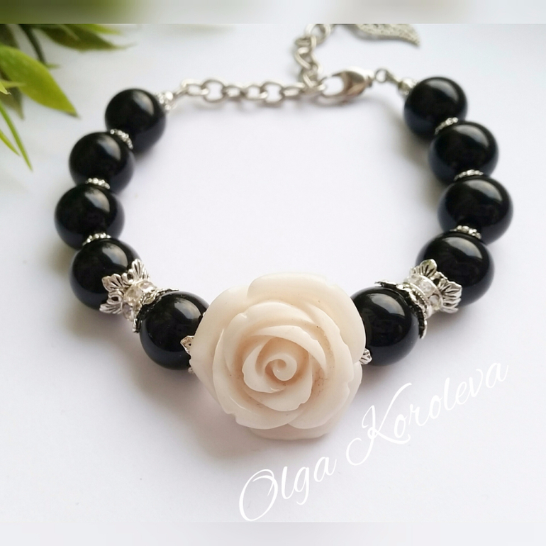Вчера родился этот браслет: из крупного черного агата с резной розой из коралла молочного оттенка. Фурнитура под серебро и милые ронделлы со стразами.