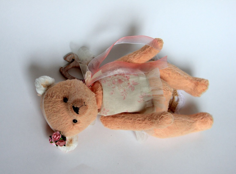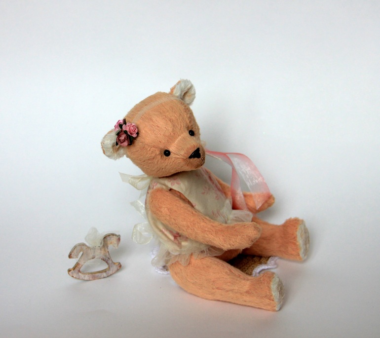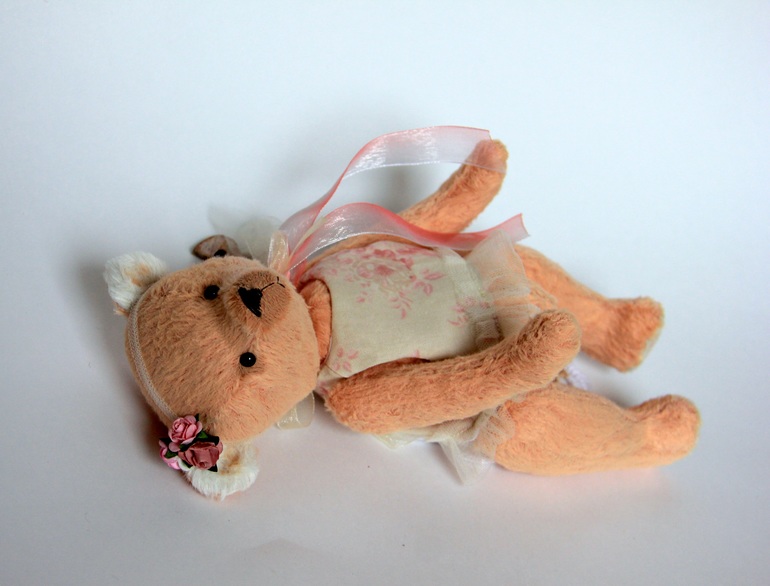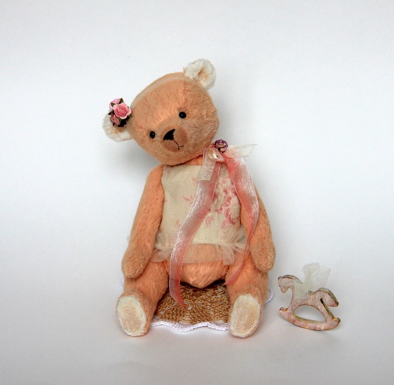 Немецкая вискоза персикового цвета, набит опилками,утяжелен стальным гранулятом. Деликатно тонирован маслом. Выкройка Гузель Костына (с незначительными изменениями).