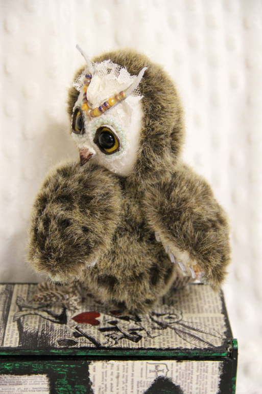 Совушка моя готова, но я вот думаю...нужно ли ее одевать...фактуры вроде как достаточно...два вида меха, хлопок, кружево, три вида бисера, кожа, шерсть, еще что-то, что я уже не помню..