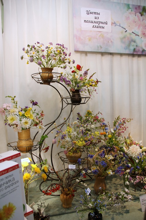 Цветы из пластики - похожи на сухоцветы, такие же хрупкие и изящные с виду. Стенд оформлен прекрасно.