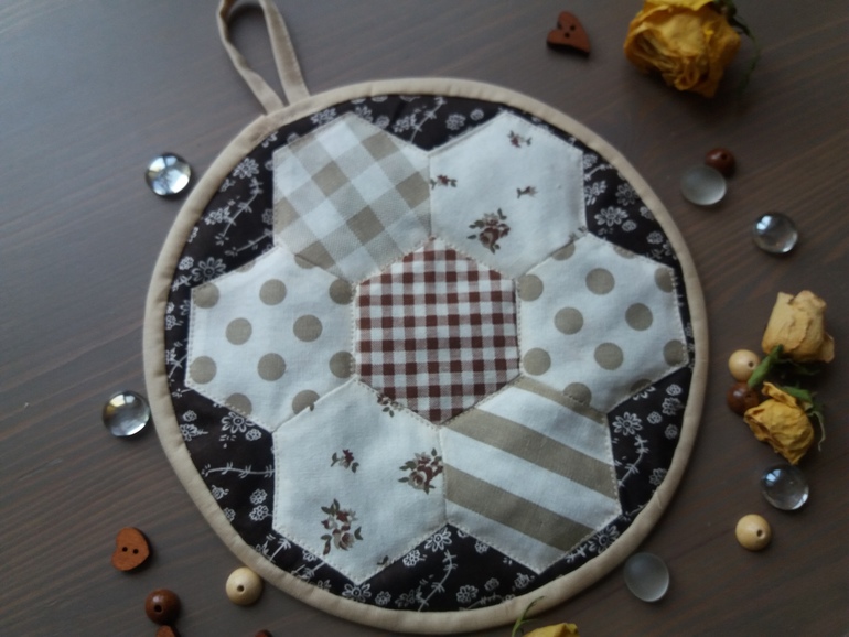 Пэчворк и квилтингВдохновившись вчера на выставке, загорелась сшить из шестигранников.Благодаря набору, что купила накануне оказалось совсе не сложно шить. Сшила для начала прихватку на кухню.Но думаю я на этом не остановлюсь, очень мне понравилось.